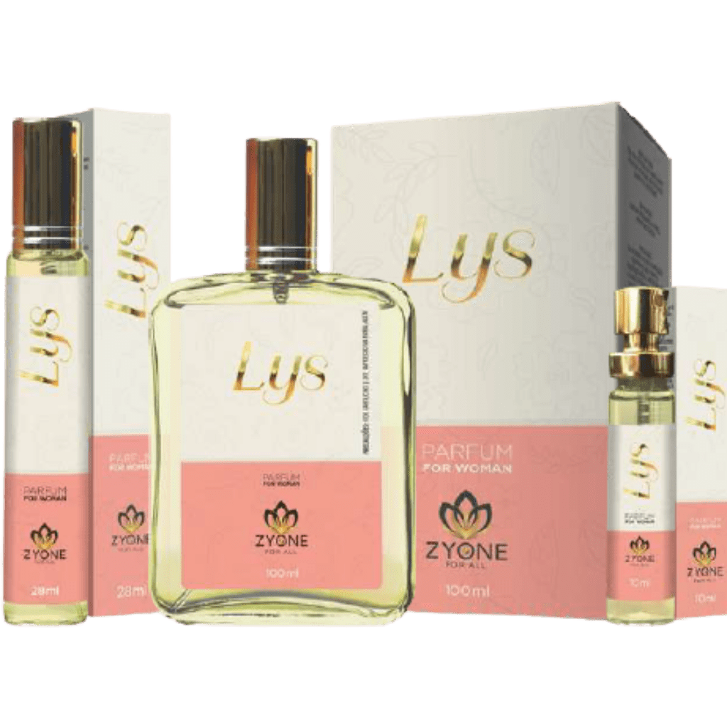 Perfume Lys Zyone Família olfativa Lys Notas de topo : Pêssego, Damasco, Pera, Pimenta Rosa e Mandarina. Notas de coração: Lírio, Jasmim, Gardênia, Osmanthus, Íris, Violeta, Narciso e Rosa. Notas de fundo : Baunilha, Âmbar, Almíscar, Sândalo, Patchouli, Musgo e Vetiver.